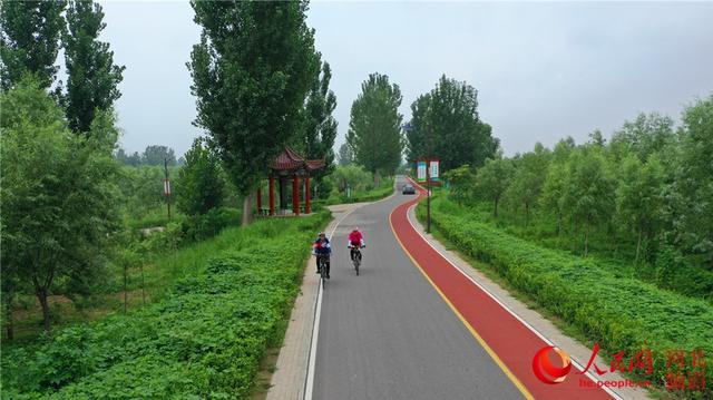 近日,當地居民在河北省滄縣運河堤頂觀光路上騎行。 人民網 袁志廣攝